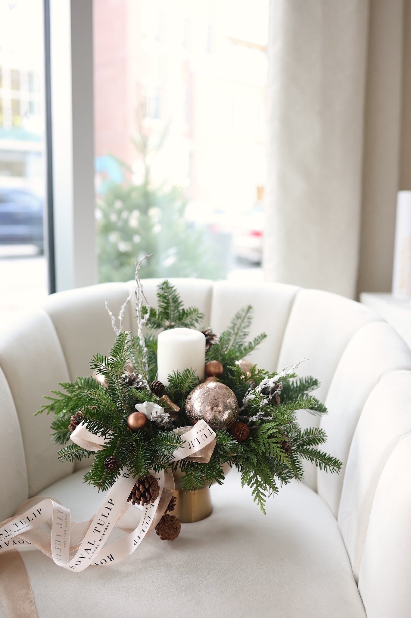 The Winter Collection from Royal Tulip is designed to create unforgettable memories for you and your loved ones. Our small table centerpiece features fresh, natural greenery, delicate decorative accents, and an elegant candle. Perfect for adding warmth and charm to any setting.
