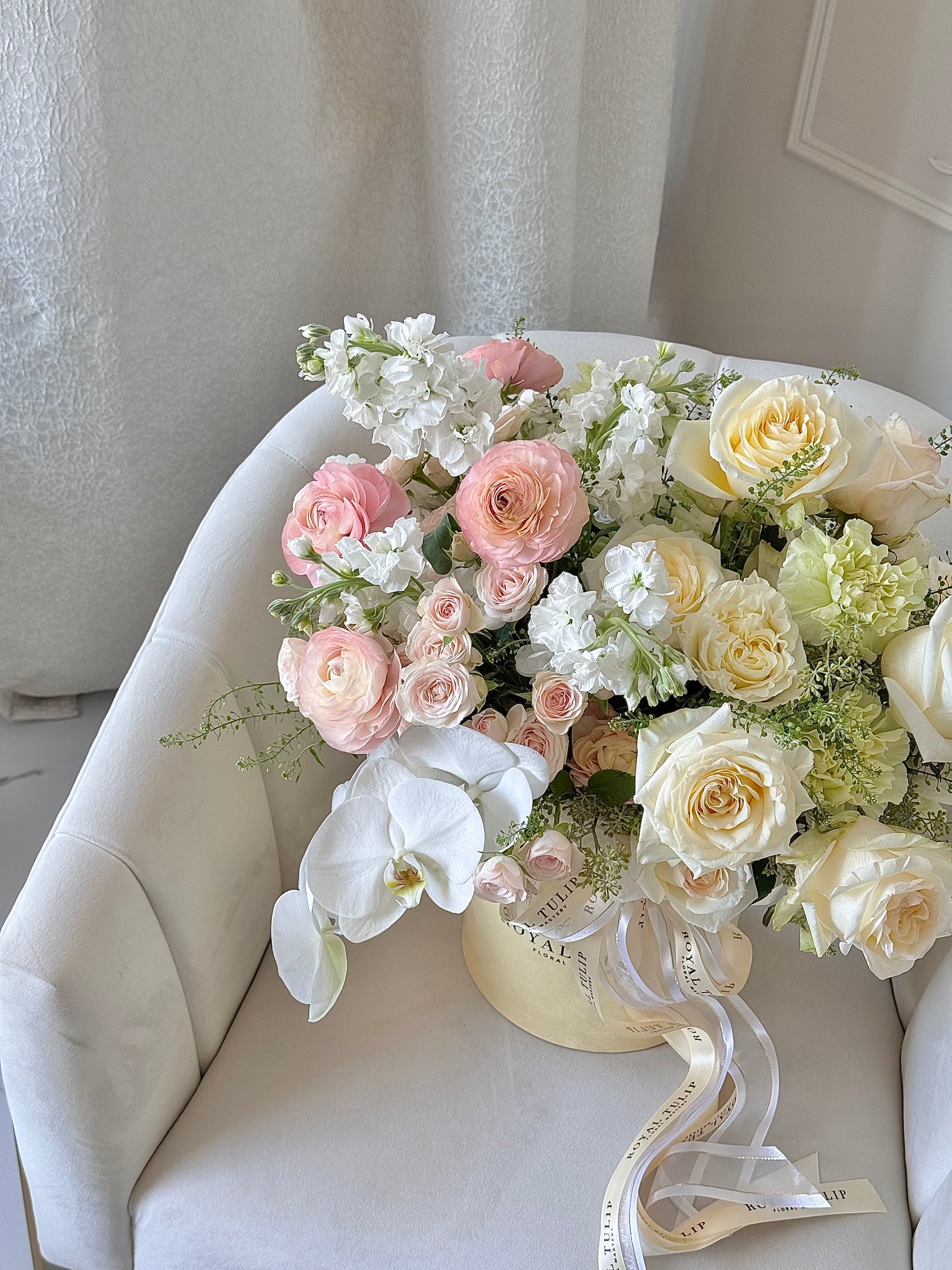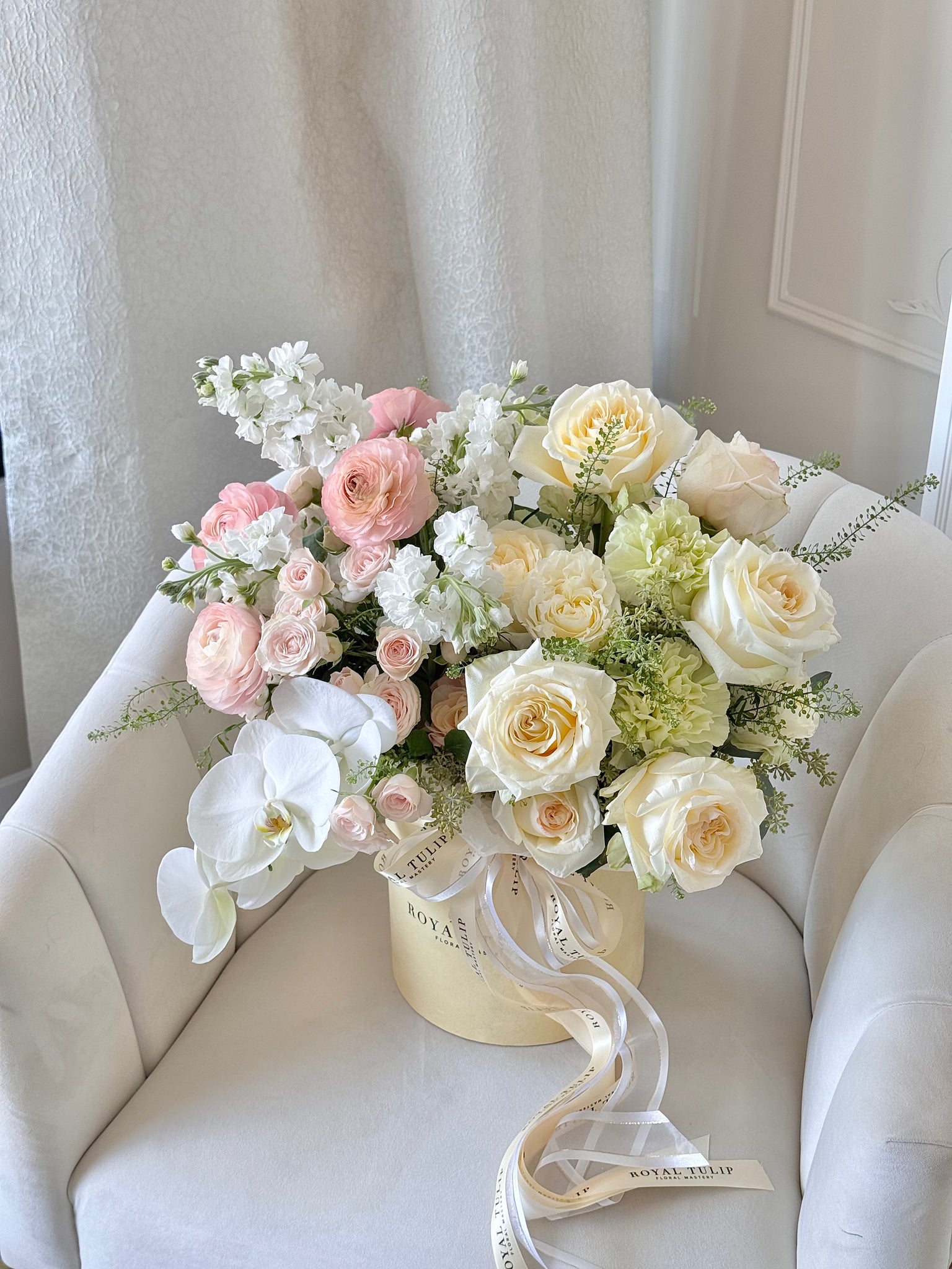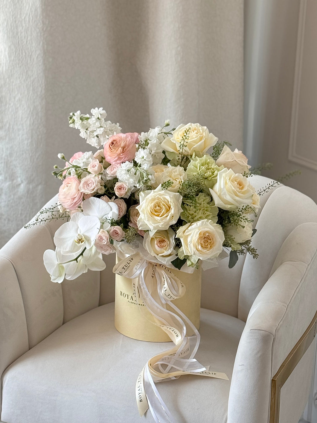 Our soft, airy arrangement of delicate blooms is thoughtfully designed to reflect a free-spirited and gentle personality. Each flower is carefully selected for its lightness, texture, and harmonious colors — including white, cream, light green, blush, and peach. The arrangement is elegantly presented in our signature flower box, with no need to transfer the flowers into a vase. Detailed care instructions are included to help your blooms stay beautiful for as long as possible.