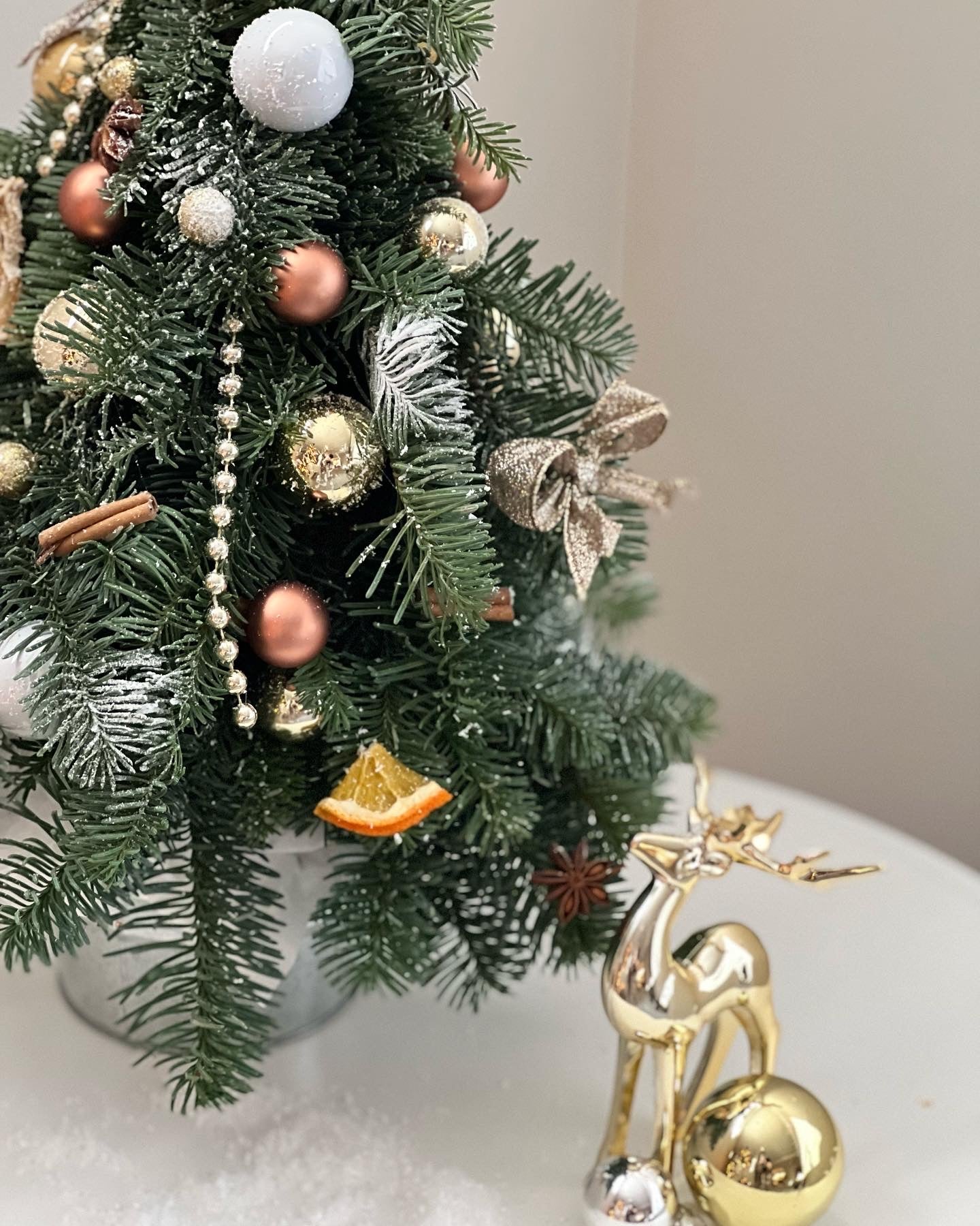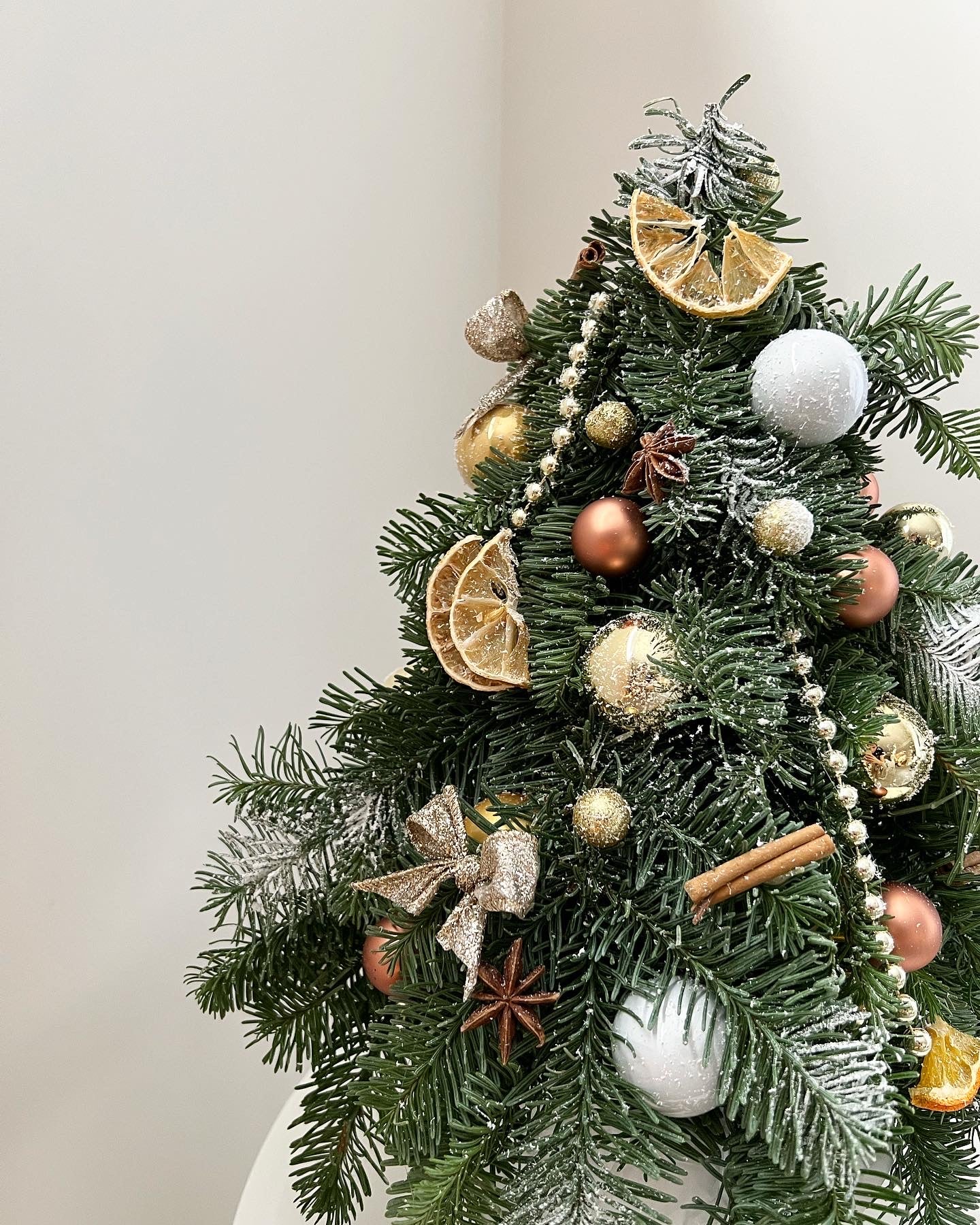 We are so excited to bring the warmth and joy of the winter holidays to your home. This elegant small Christmas tree is made of live greenery and will become a beautiful part of the decor for outdoor or indoor. It's a nice gift for loved ones, friends, or colleagues. An arrangement will be designed in white/golden color (size: 17" / 43 cm).